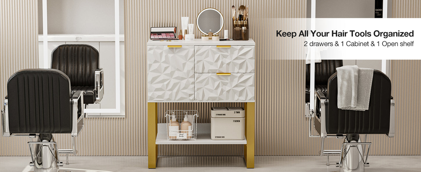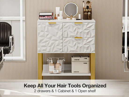 Our wall mount salon station offers efficient and convenient tool access with 3 drawers, 3-tier shelf, and a cabinet. Keep your workspace tidy and organized!