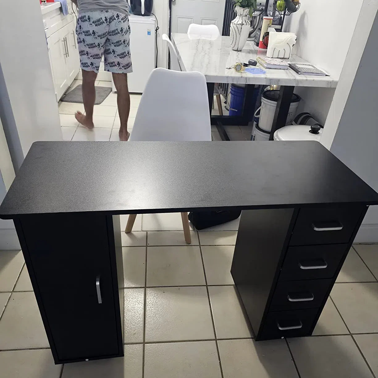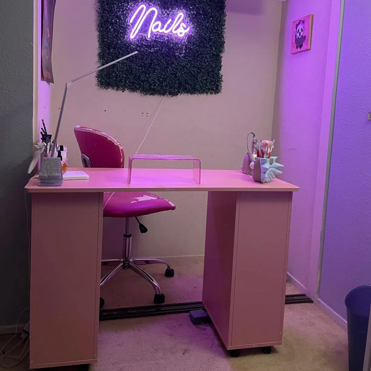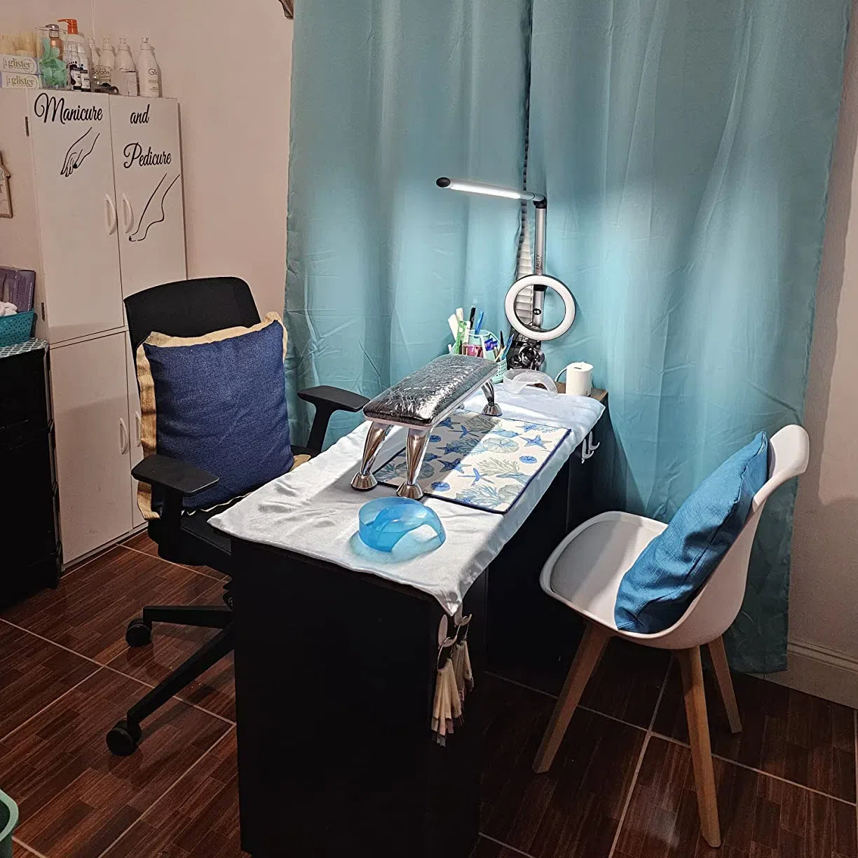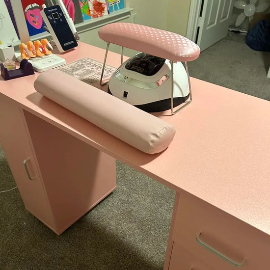This manicure table features a side cabinet and four drawers, offering ample space for nail polishes and tools storage.