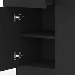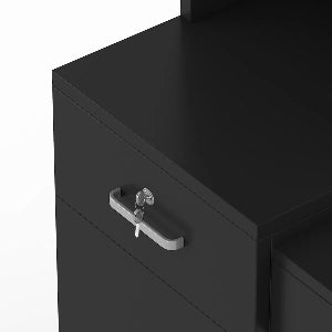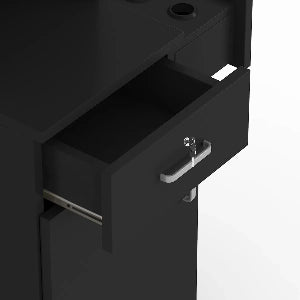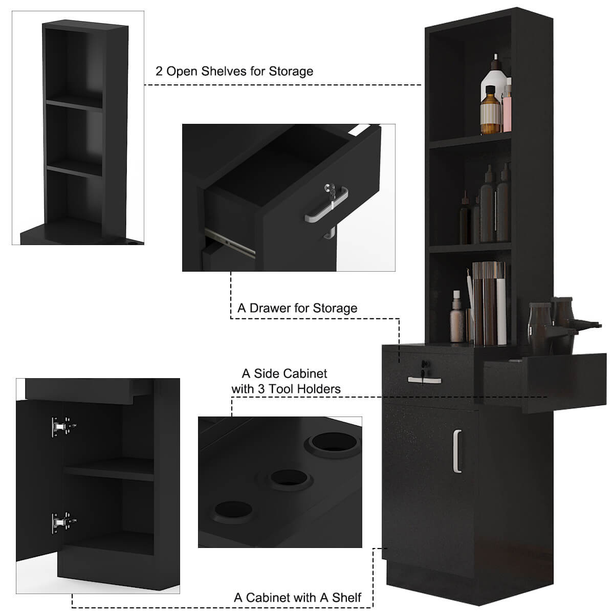 This styling station is fitted with 3-tier open shelf and large bottom cabinet for storage and one lockable drawer for personal belongings.