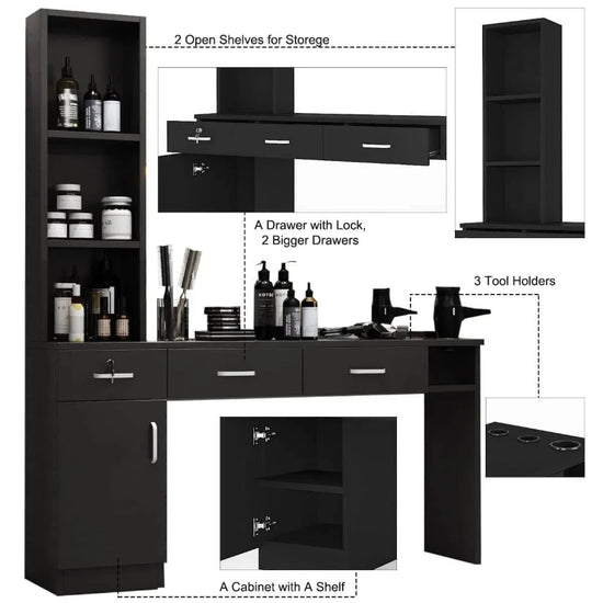 This wall mount styling station is a fantastic addition to any salon. The sleek countertops, spacious drawers, large cabinets provide ample space for tools while maintaining an organized work area that enhances productivity.