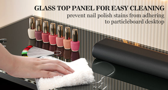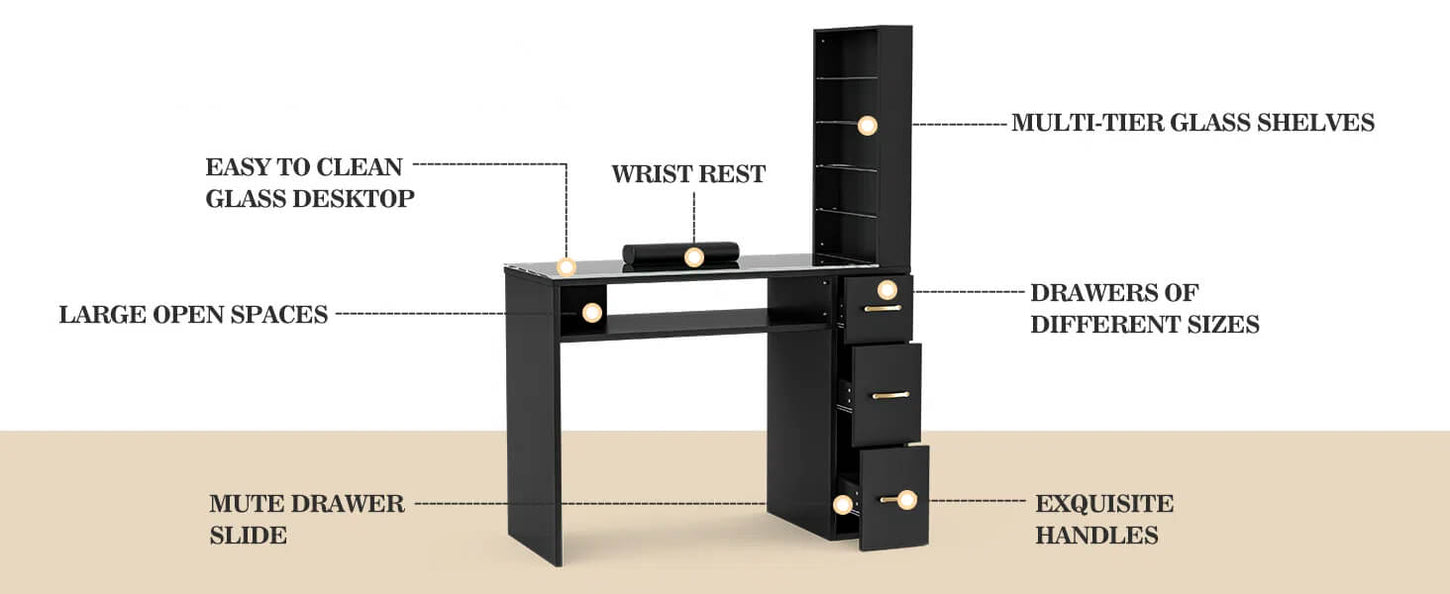 This contemporary-chic nail table features a tempered glass top work surface and plenty of storage to keep your space clutter-free.