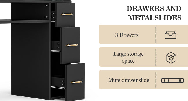 Paddie Glass Top Nail Table, 4-tier shelf, 3 drawers