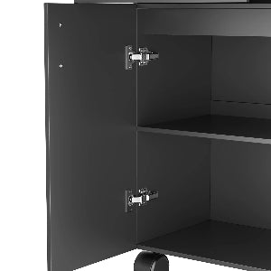 A great multi-purpose cart for hair stylists, which features 5 tool holders, 2 drawers, 2-tier large cabinet, smooth-glide slimline wheels, and a large top workspace.